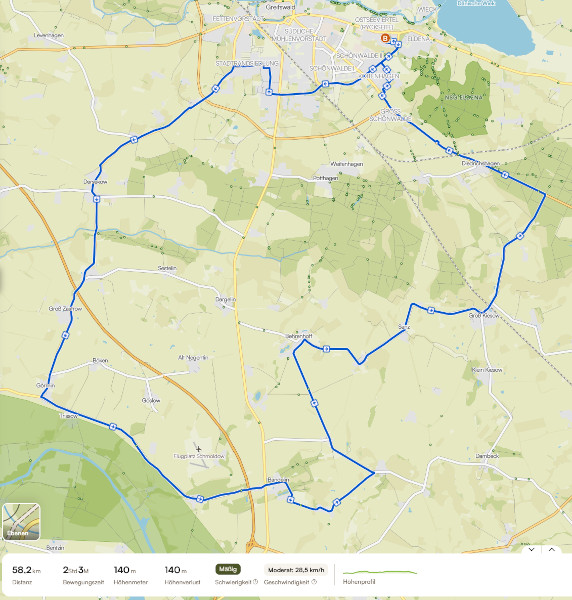 Der Start auf die drei Strecken (sportlich ca. 60km, Fitness ca. 45km, Familien ca. 20km) erfolgt um 9:45 Uhr ab dem Radcenter Fründ (Rigaer Str. 9, 17493 Greifswald, Ostseeviertel-Einkaufszentrum). Gefahren wird im geschlossenen Verband unter Führung der Sportsfreunde des TRG.