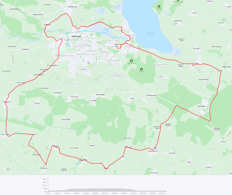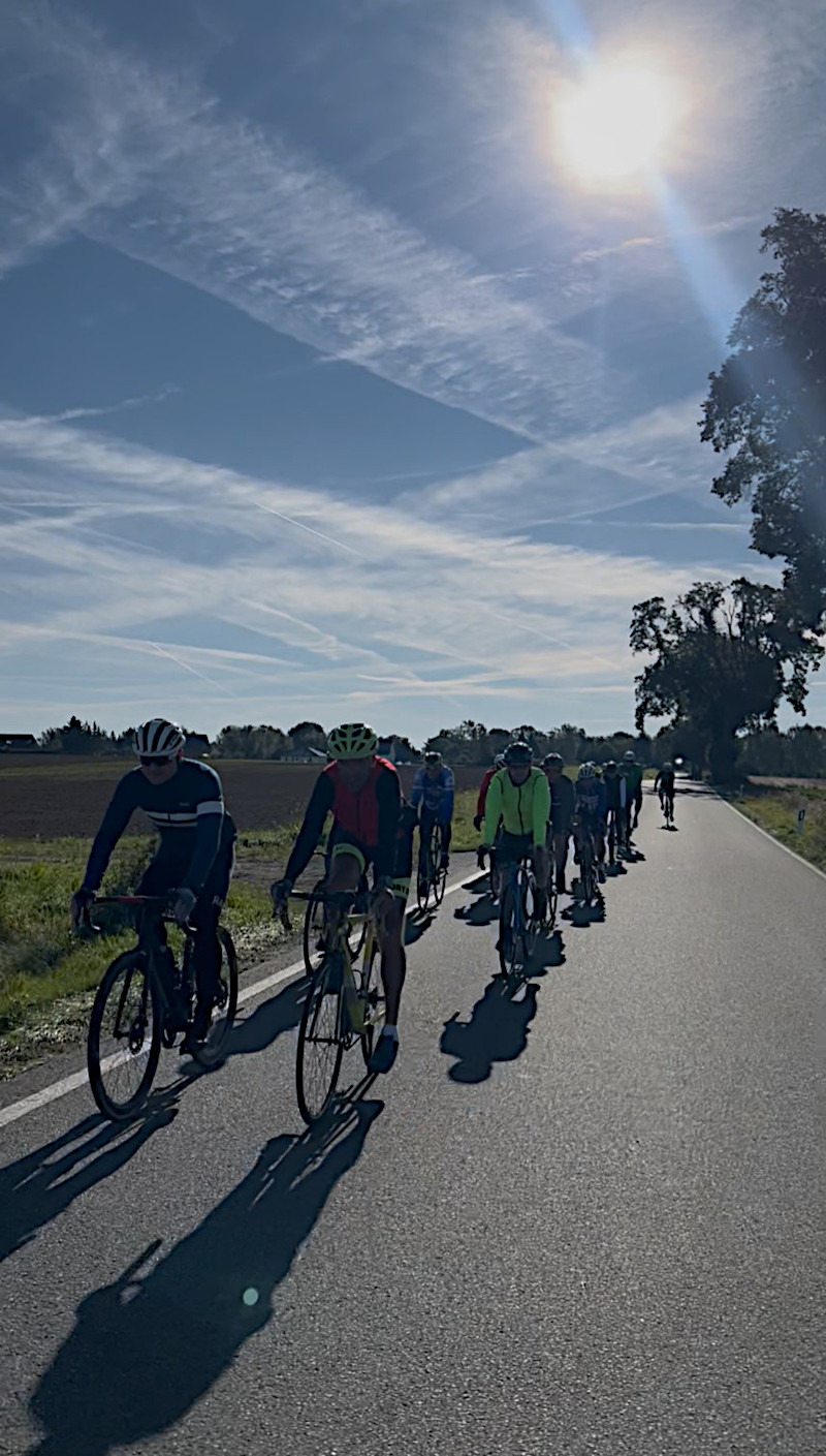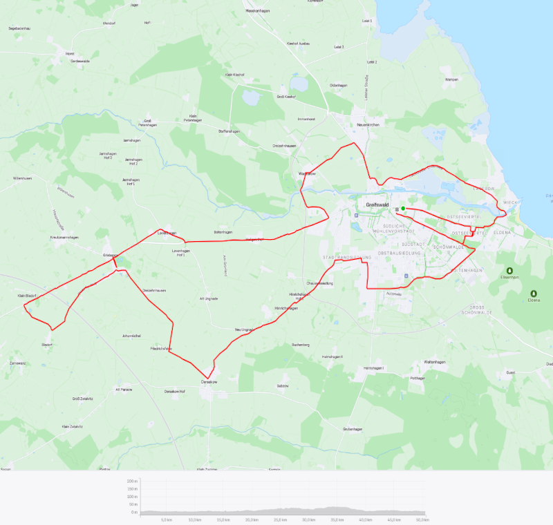 Gegen 9:45 Uhr schickte der Vereinsvorsitzende des Teams Radmarathon Greifswald e.V. die gutgelaunten Teilnehmer auf die drei Strecken, die jeweils von Sportfreunden des Vereins angeführt wurden. Bei der kurzen Familienrunde (23 km) und der Fitnessrunde (48 km) fanden sich ca. 20 Radler ein. Nach 20 km machte die Gruppe der Fitnessrunde eine kurze Rast in Griebenow und fuhr über Bisdorf und Dersekow zurück nach Greifswald. Die 62 km lange sportliche Runde nahmen knapp 40 motivierte Rennradfahrer in Angriff. Dabei beschreibt „Angriff“ fast den Kern dieser Gruppenausfahrt. Wurde bei der Einweisung noch vom vorsichtigen Schnitt mit 28 km/h gesprochen, waren es am Ende 31,5 km/h – so fix waren wir in den letzten fünf Jahren nicht. Offensichtlich stimmten die Beine, die Sonne gab Energie und der Wind hielt sich in Grenzen. Es wurde viel geplaudert, die Autofahrer nahmen Rücksicht, die Zweierreihe funktionierte bestens.